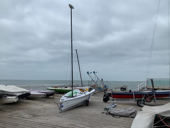 Over the years, we learend that with an onshore wind, leaving the boat half-rigged and going on a run on the trailer makes it really easy to get back on land – even if no one is around.