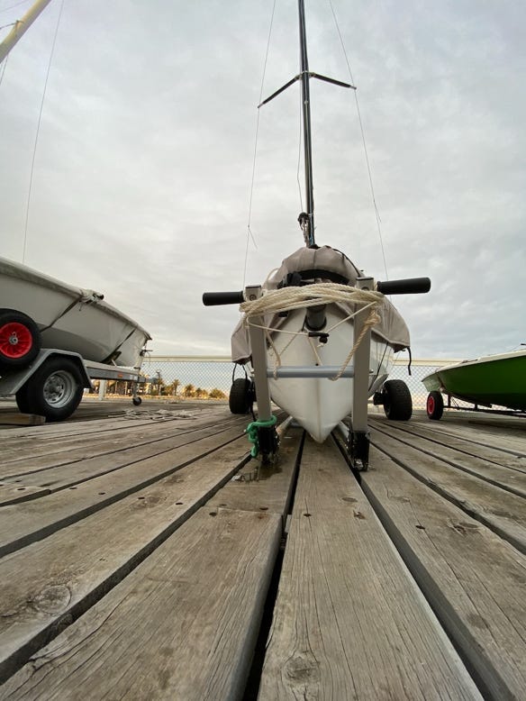 In Port Melbourne, we sail off a beach. It’s soft sand – about 200m of it that you need to conquer if you have to go the long way. Often I sail by myself – and no one else is around (to help pushing & pulling).
